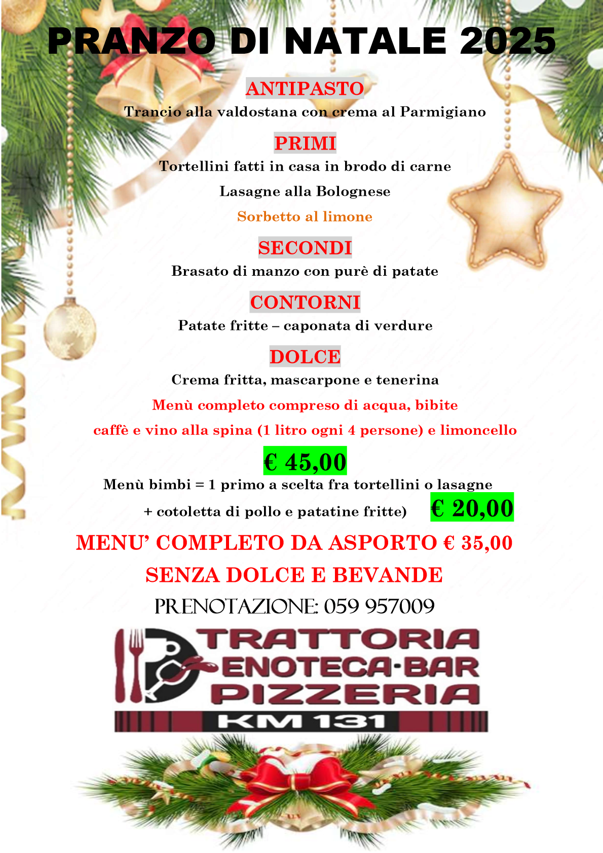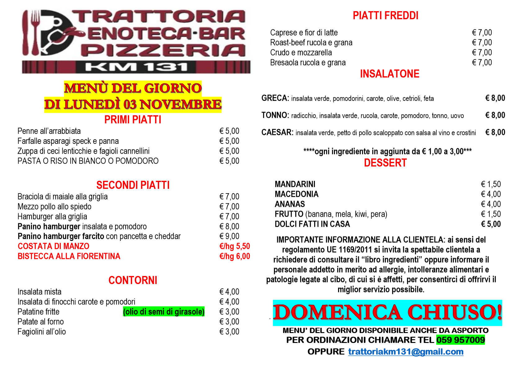 Siamo aperti dalle 04:30 di mattina con le nostre gustose colazioni, proponiamo pranzi veloci ed economici con un menù del giorno che varia quotidianamente La nostre proposte del menù alla carta prevedono primi di pasta fatta in casa, carni pregiate e per finire i dolci tutti prodotti in casa da noi