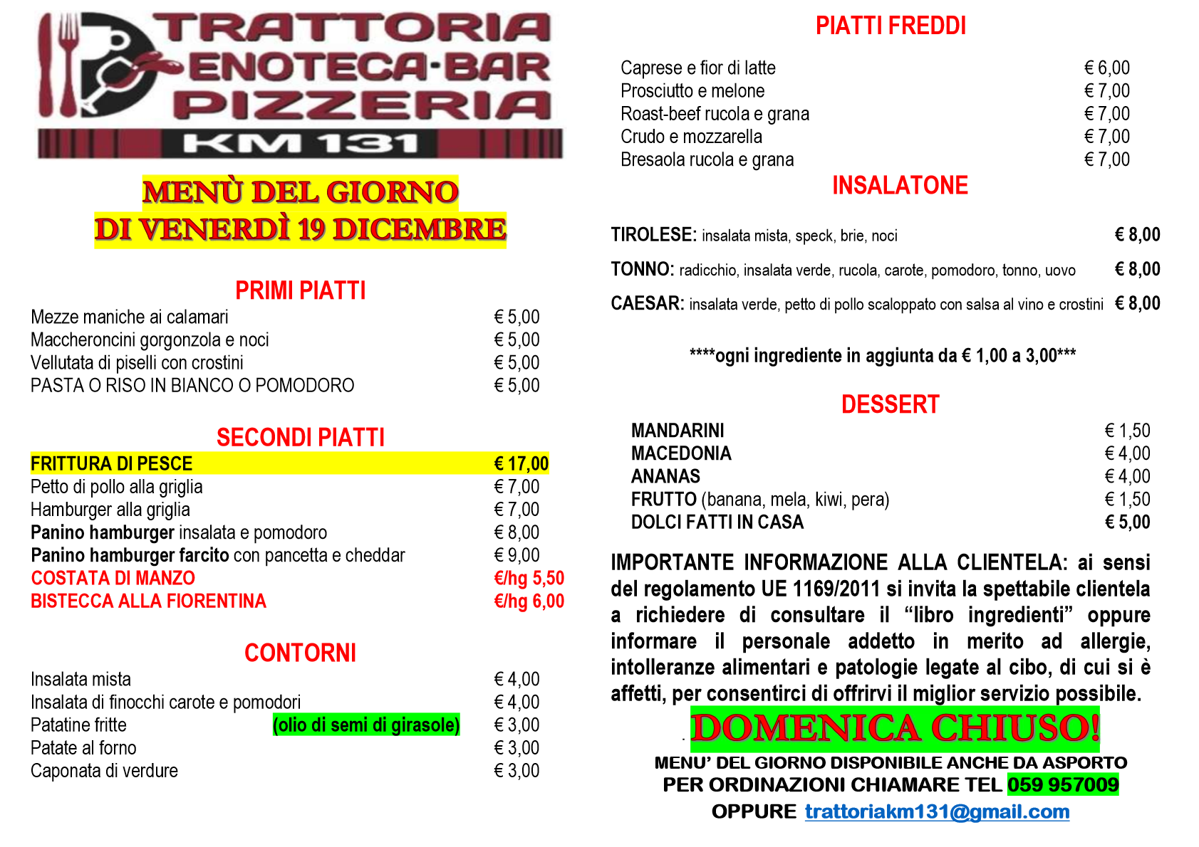 Siamo aperti dalle 04:30 di mattina con le nostre gustose colazioni, proponiamo pranzi veloci ed economici con un menù del giorno che varia quotidianamente La nostre proposte del menù alla carta prevedono primi di pasta fatta in casa, carni pregiate e per finire i dolci tutti prodotti in casa da noi